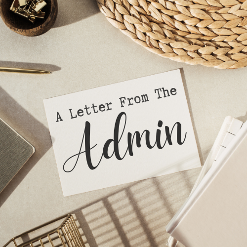 note card sitting on desk with office supplies, text on note reads A Letter From The Administrator